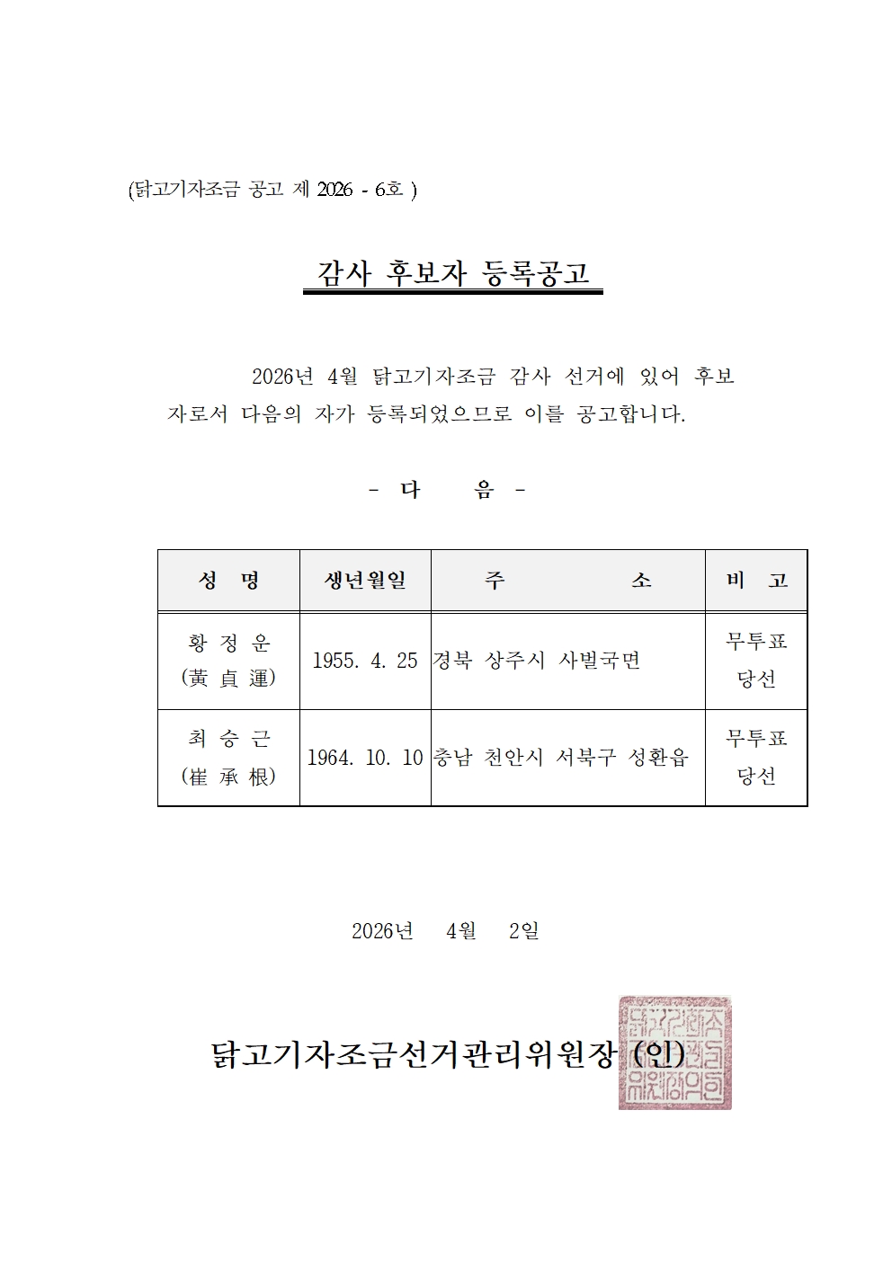 [°ø°í Á¦2026-2È£] ´ß°í±âÀÚÁ¶±Ý ´ëÀÇ¿øÈ¸ ÀÇÀå, °¨»ç, °ü¸®À§¿øÀå ¼±°Å °ø...