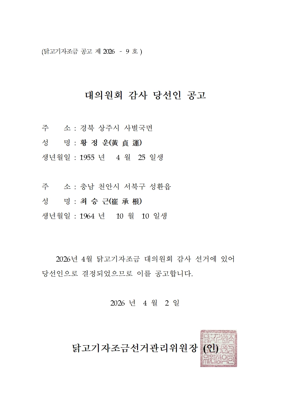 | ´ß°í±âÀÚÁ¶±Ý ´ëÀÇ¿øÈ¸ °¨»ç ´ç¼±ÀÎ °ø°í | |||