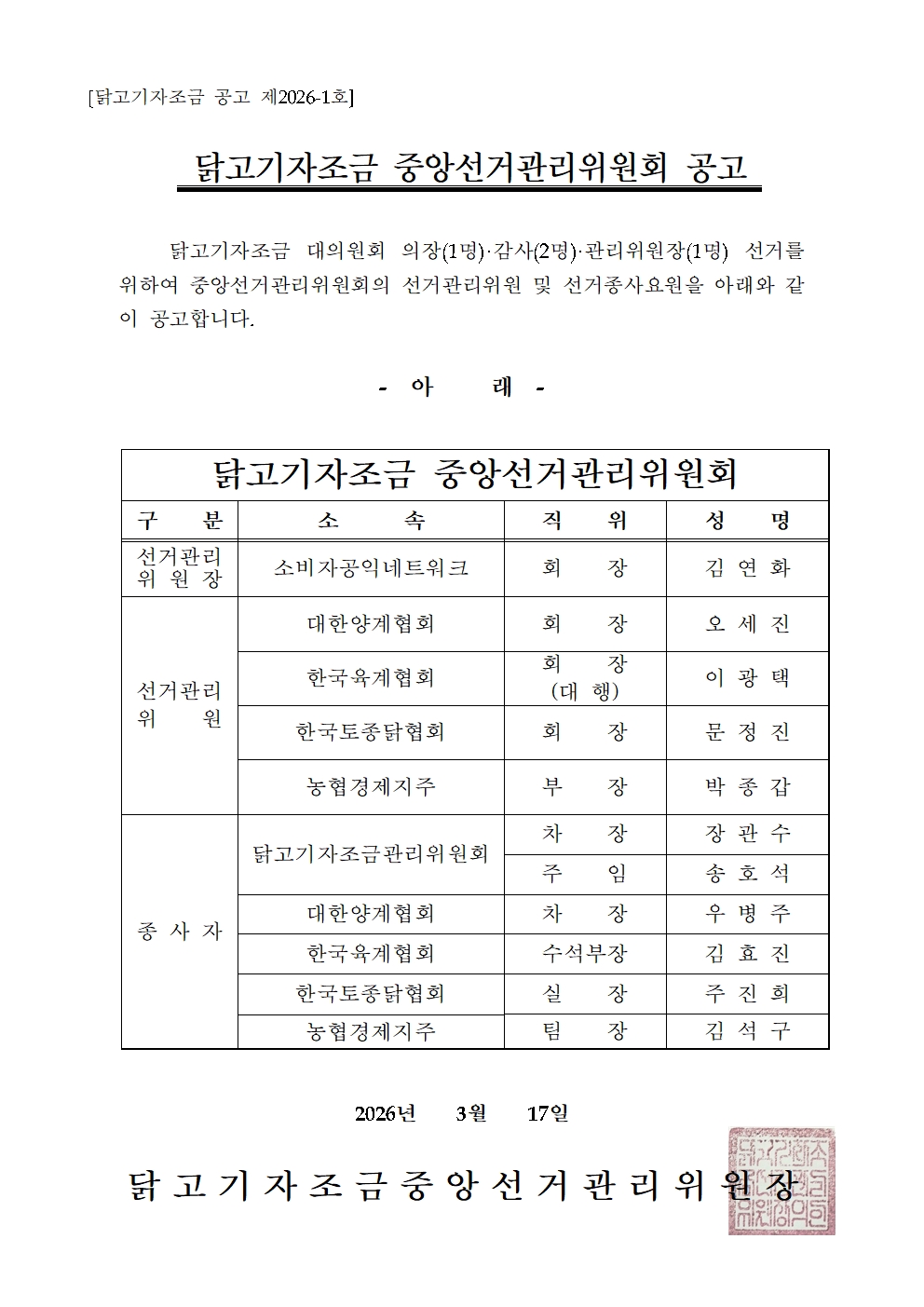 | [°ø°í Á¦2026-1È£] ´ß°í±âÀÚÁ¶±Ý Áß¾Ó¼±°Å°ü¸®À§¿øÈ¸ °ø°í | |||